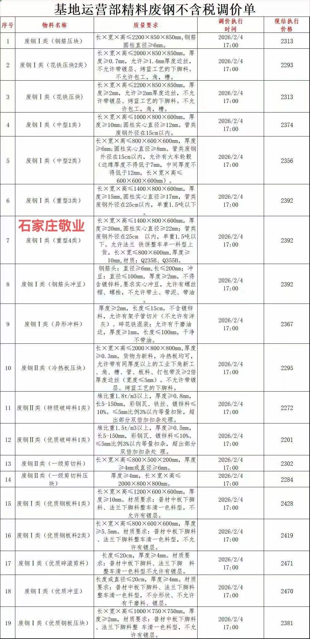 *日石家莊敬業(yè)毛料最新價(jià):鋼筋團(tuán)子****,中型*類A:****,中型*類A:****,重型*類A:****,重型*類A:****,二級(jí)剪切料****,不含稅。