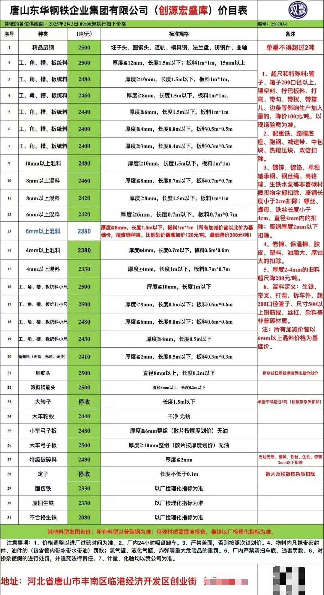 唐山東華鋼鐵(創(chuàng)源宏盛庫)地址:唐山市豐南區(qū)臨港經(jīng)濟開發(fā)區(qū)興業(yè)街。*月**日**:**起,所有料型上調(diào)**元,詳見價目表。不限車型、卸車迅速