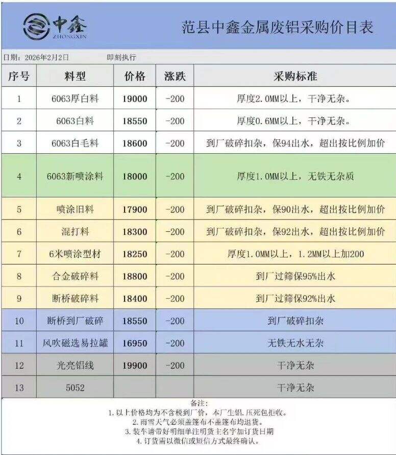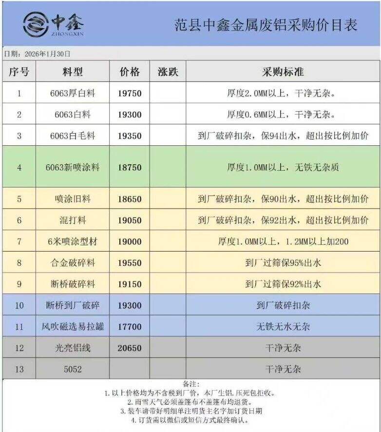 ****年*月**日河南范縣中鑫金屬廢鋁采購價目表